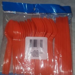 Enhance your celebrations with this Heavy Duty Plastic Cutlery Set. Featuring vibrant orange utensils, this set is perfect for any occasion. Includes 16 spoons, 16 forks, and 16 knives.