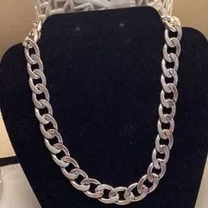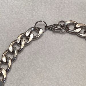 This heavy duty silvertone curb chain works for men or women and has a 18” length.  Large lobster claw clasp and nice weighted piece