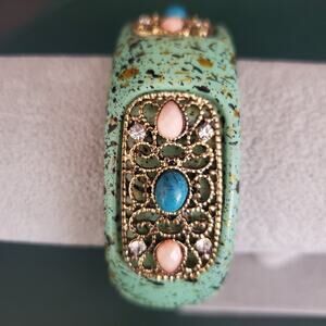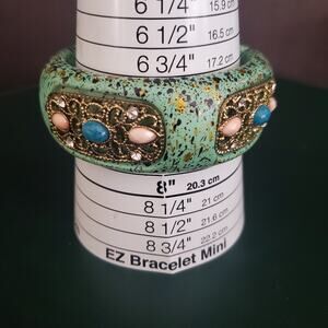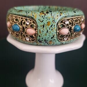 This heavy bangle is unique with a green splatter pattern with gold accents. There are gold tone filigree sections with beads and crystals plus it has a strong magnetic clasp. 1 1/8 inch wide. Very good condition
