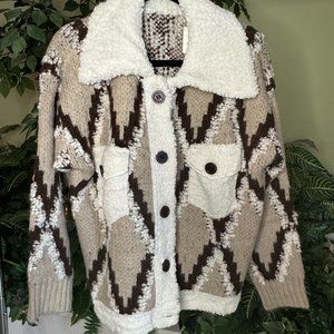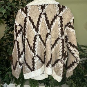NEW- no tags. You won't need a winter coat with this in your wardrobe! Gorgeous button front cardigan in brown, white, beige ft. 2 front pockets, banded hem and cuffs.