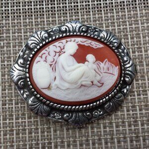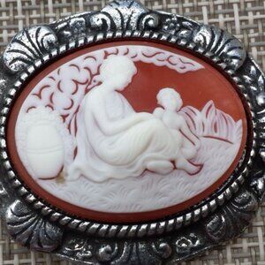 Heavy Pewter Steel Cameo Ring Brooch Vintage