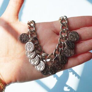 Heavy Silver Curb Chain Necklace with Coin Dangles – Chunky Statement Collar
