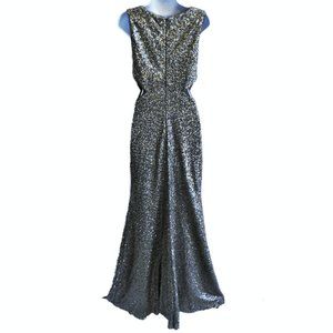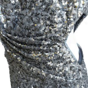 Heavy Silver Sequin Ruched Evening Ball Gown Elegant High Neck. Sleeveless. Trumpet Skirt. Peekaboo Diamond Cutout Sides. Twist Bodice. Concealed Back Zipper. Made in USA. Tagged Size 8.