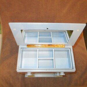 Hinged top with mirror and removable compartment.