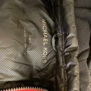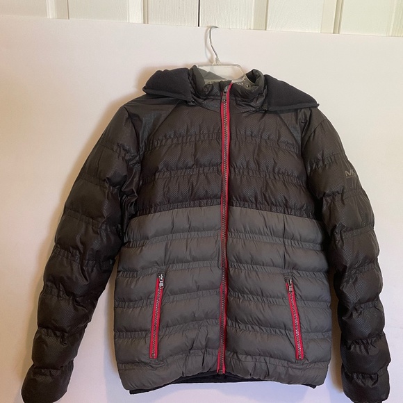 Boy's size 18-20 puffy jacket; two toned grey, with red zippers in front; zippered, removable hood. Like new condition.