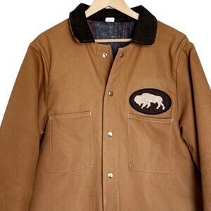 Rugged brown canvas work jacket with a warm wool blanket lining and corduroy collar. Size Large (42–44). Great for cold weather, outdoor work, or everyday wear.
