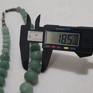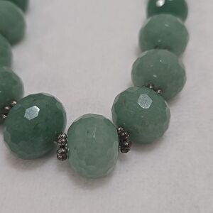 This stunning necklace features faucetd green jade beads in varying natural color and graduated size from 12-18mm.