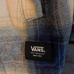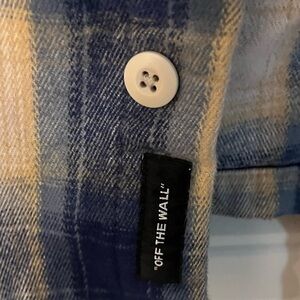 Stylish blue and cream plaid button-up heavy weight shacket. Perfect for casual fall/winter wear.