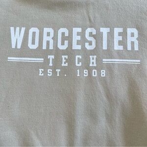Stay cozy in collegiate style with this Worcester Tech Heavyweight Hoodie in a neutral tan hue. Features bold white varsity-style lettering, a soft fleece interior, front kangaroo pocket, and relaxed fit for all-day comfort. Perfect for casual wear, lounging, or layering on chilly days.