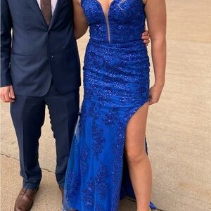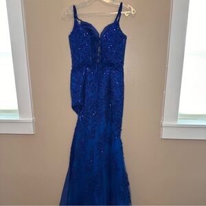 This stunning blue gown features a sweetheart neckline with delicate spaghetti straps, perfect for a prom or cocktail event. The luxurious fabric flows into a mermaid-style skirt, creating an elegant silhouette. The dress's sleek design and rich color make it a timeless choice for any special occasion.