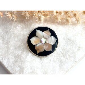 Silver toned Hecho De Mexico abalone / mother of pearl inlaid floral brooch. The brooch is round shaped a 6 petaled flower at the center, inlaid with MOP. Made in Mexico. Silver toned surrounded by black enamel.