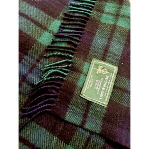 From Hector Russell Kiltmaker Group. Inverness Scotland. 100% all wool. Green blue tartan plaid blanket scarf with fringe trim throughout. Dry clean only. Made in Great Britain for Hector Russell. Preowned in good condition with no stains or tears.
