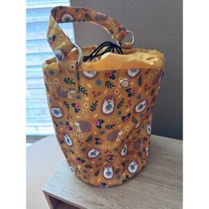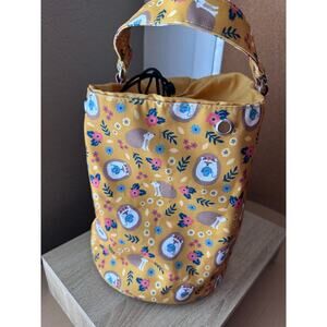 Brighten up your accessories with this charming drawstring bucket bag featuring an adorable hedgehog and floral print on a mustard yellow background. The bag has a sturdy cylindrical shape with a base diameter of 8.5 inches and stands 10 inches tall, providing ample space for your essentials. The 14-inch handle is reinforced with metal rings for comfortable hand or arm carry.