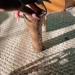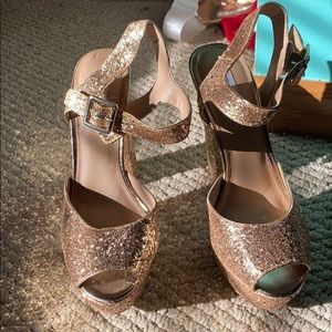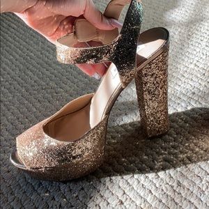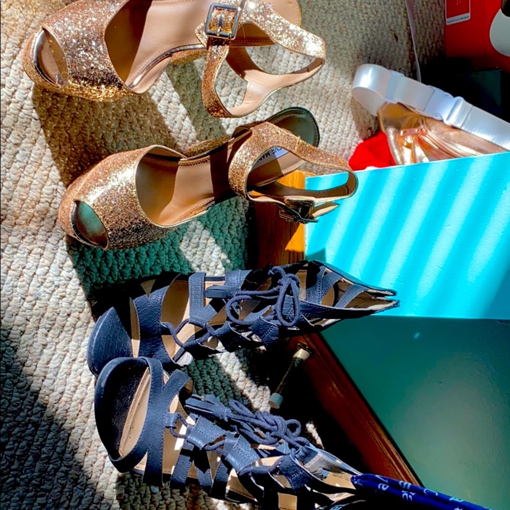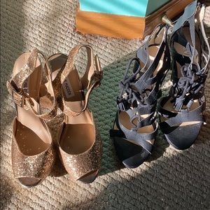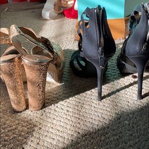 The gold ones are Steven madden size 9.5 The black ones are a size 10 Both worn once very comfortable if you like heels Selling both pairs TOGETHER