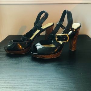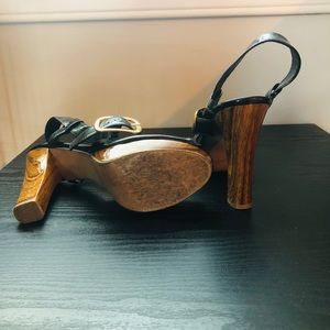 Qupid size 7 heel. Shiny black cross straps with gold buckle, shiny polished wooden heel 4 1/2” and platform 3/4”. Lightly worn, 1 small scuff on left heel, buckled slightly tarnished