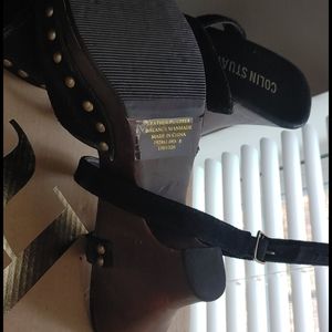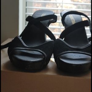 Sexy black suede beaded cross strap side closer brown semi wedge heel small chip right side right top of outside heel worn once gently in fashion show....no box