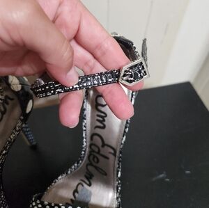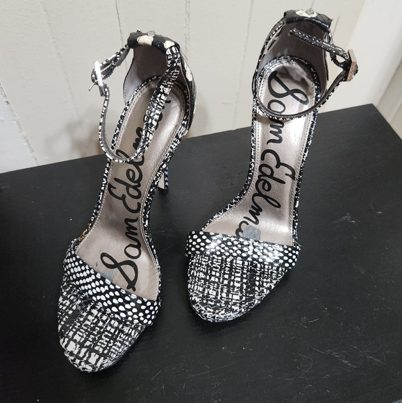 Black and white mutli design heel with ankle strap. There is a little platform. Have been worn a couple of times, but in good condition. I had shoe inserts. That's why you see a little circle piece removed inside both of the shoes.