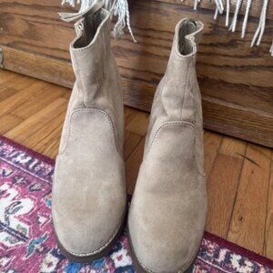 These JustFab Women's Boots feature a stylish ankle shaft with a round toe and zip closure, making them perfect for casual occasions. The beige suede material and mid-height block heel add a touch of elegance to the bootie design. The brand's reputation for quality and fashion-forward footwear ensures that these boots will be a versatile addition to any woman's wardrobe. Pair with cropped jeans or a fall dress! Pre-owned with signs of wear, but still in nearly excellent condition.