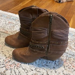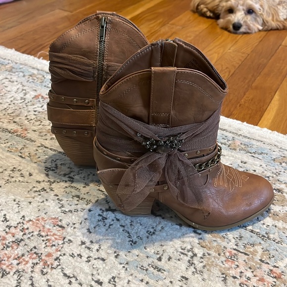 Heeled ankle cowboy boots with jeweled ankles. Have been worn less than 10 times in pageants, and still in really good shape!