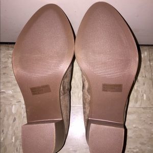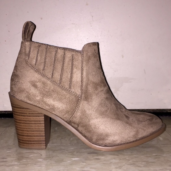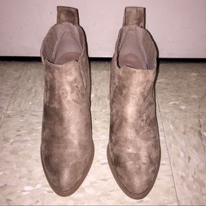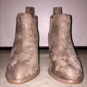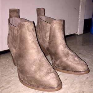 Never Worn. Size 9; light brown booties with a 3” heel; made of suede material.