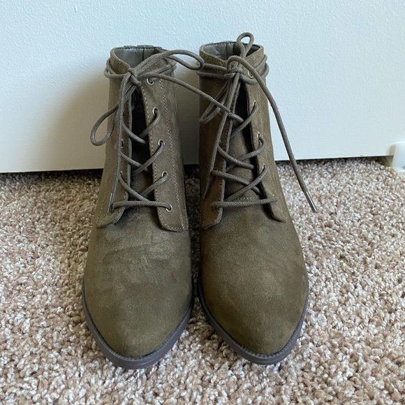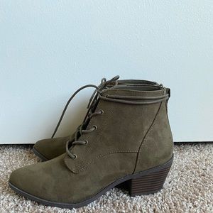 Brand new, without tags. Never worn heeled booties. A deep olive color. Would be perfect for fall! Size 6 1/2. From a smoke free home.