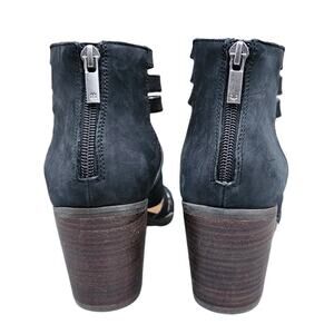 Black nubuck leather upper, strappy cage gladiator style w/ open round toe, chunky heel, rear zip, ankle height. Issues noted in photos. Very good preowned condition, overall. Size 8.5M by Lucky Brand. Style: Kyndrah.