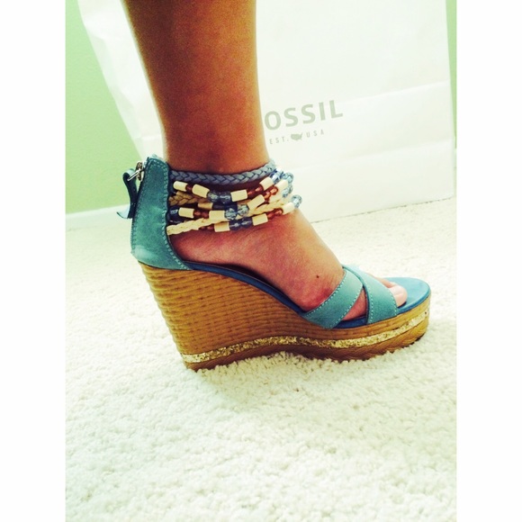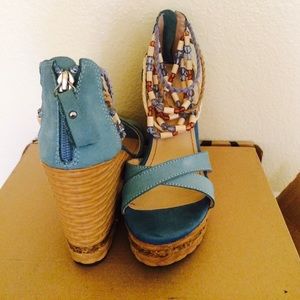 Artsy 4 inch heeled sandal. The beads add an artistic touch to the ocean teal. Never worn, another gift too large for my feet..😊
