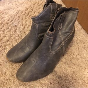 Cute size 8 bootie with a heel. Dark gray material with some cream stitching and dark brown heel. Little bent from being shoved in my closet for over a year but still lots of wear left in them!