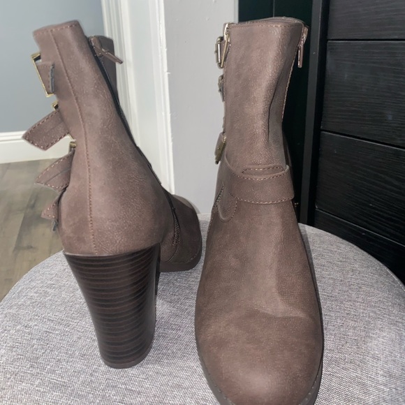 Never worn brown heeled booties with buckle details
