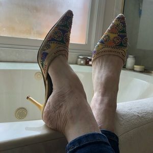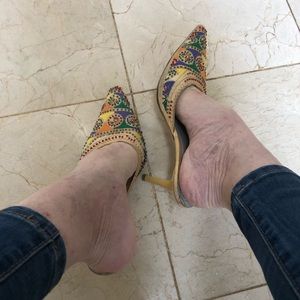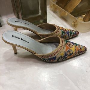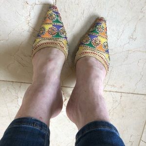 Heeled mule slippers, colorful embroidery with beads, comfortable short heels, Size 6.5. By Varsava Vamara. They’ve been wore and loved, still so cute.
