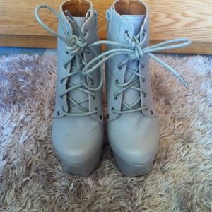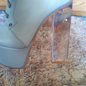 Stone colored heels. Lace up front and zipper on side with clear heel. Still in box never been worn.