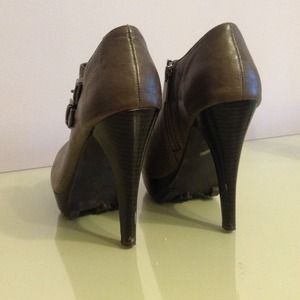 Brownish heal with zippers on the inside and buckles on the outside. 5 inch