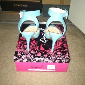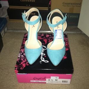 Ankle strapped closed toe heel. Color light turquoise suede pu