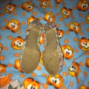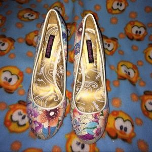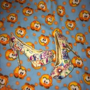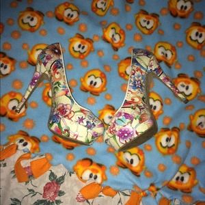 High heels have been worn twice. They are creased from the back. They're pretty high. Estimating to about, 6 or 7 inches with platform.