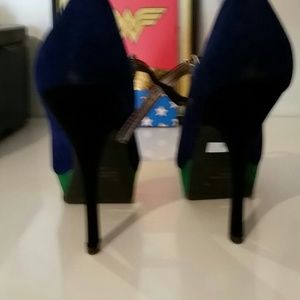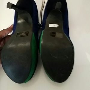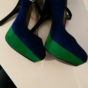 Green, navy blue and black. Faux suede heels, very comfortable. Only worn to once to a club.