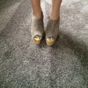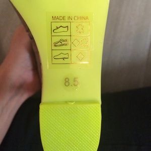 Fun, never worn, open toe, suede tan color with neon yellow pops and the base of the shoe in cork
