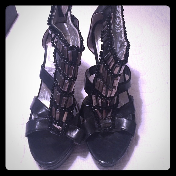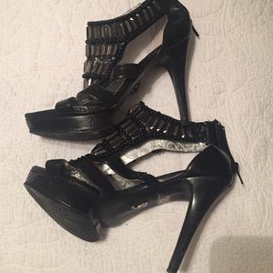 Black heels that zip up in the back and silver on the top. Size 7 fits more like an 8