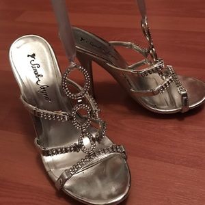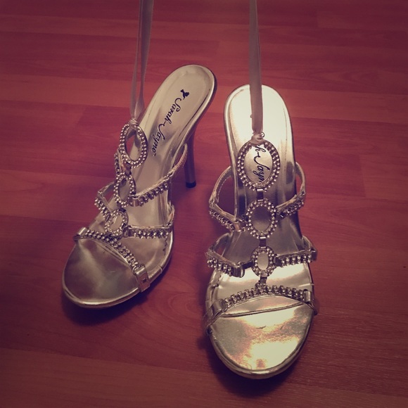 Silver heels. With ribbons to tie around ankle. Wore once. Love them but time to go. They have been kept save in their original box.