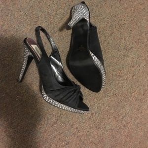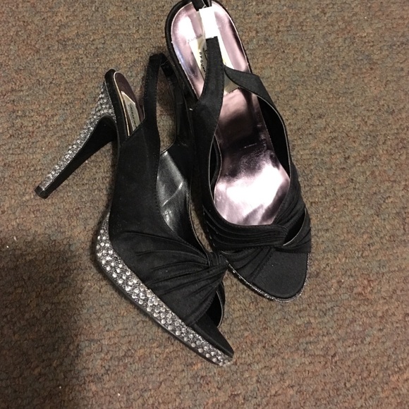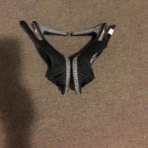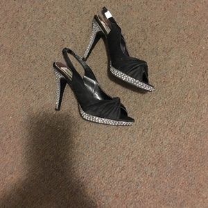 Black dress pumps with stones on heels and around the border of the front. Little not on top of toe area. Heels are 4". Never worn, heel is a little too high.