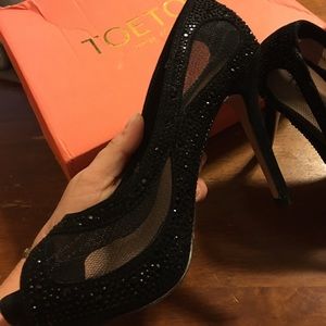 Peep toe black pearl heels