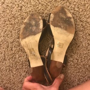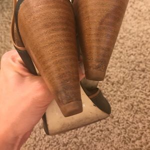 Black and brown leather French Connection wooden heels. Well worn but in good shape.