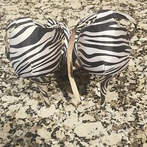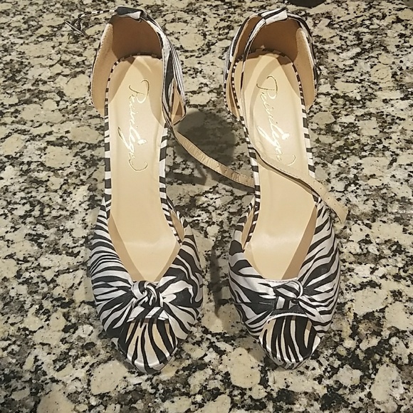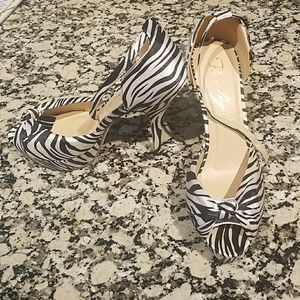 Zebra print heel with a peep toe. 5" heel with a 1" platform. Worn once