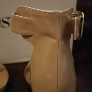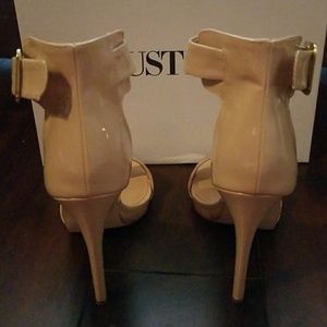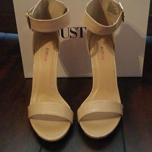 Justfab strappy heels. Color is blush/nude. Size 81/2. Heel is 4in I believe. Jas a small tear on inside of buckle on the right shoe (shown in pics) also has a slight dent in back of right shoe on the left side(shown in pics). That's from how I had them in box.(Sorry!) Other then that they are in great condition only worn twice. Also comes with 2 extra heel screws in color black.