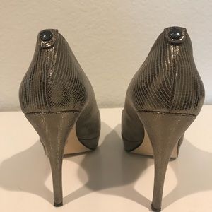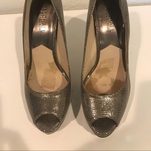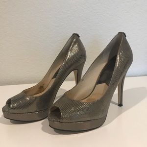 Michael Kors Collection Size 7 platform peep toe heels with a metallic snakeskin sheen. Perfect neutral heel. Worn once or twice. Perfect condition.