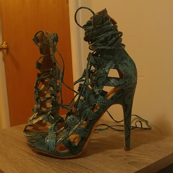 5 inch turquoise snake print open toe 5 inch heels. Just fab brand. Practically brand new. Worn 1 time inside.