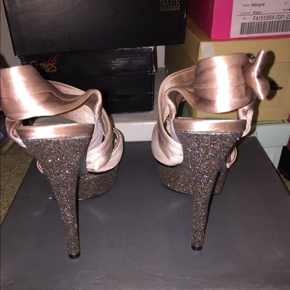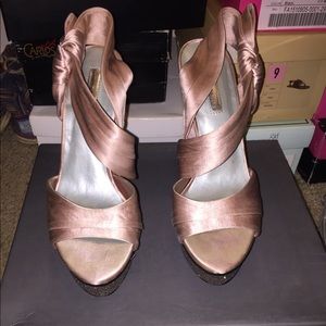 Satin Blush color shoe with multi-glitter platform heel. Heel is about 4 1/2 to 5 inches. Gently used. Would be the perfect wedding, prom or nice outing shoe.