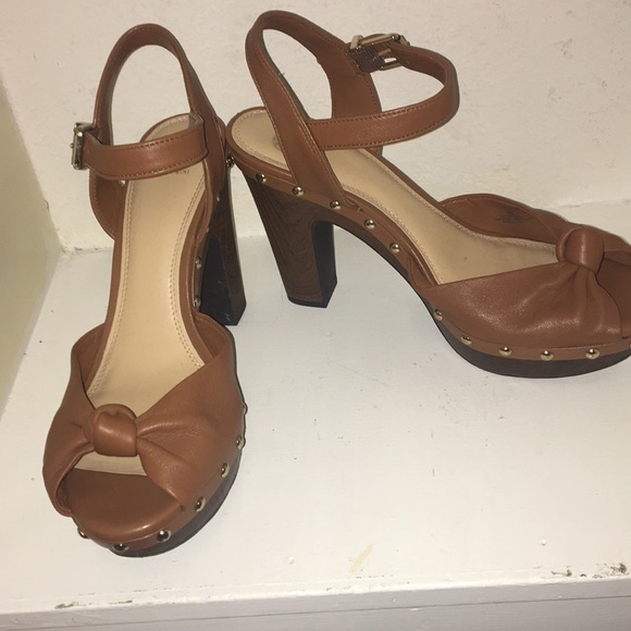 Wooden heel with studs along the shoe. Worn one time and in excellent condition! Super cute and perfect for spring/summer outfits!