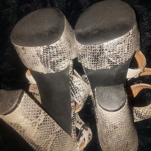 Snakeskin platform blocked heels. Heel height is 5 in. There are scuffs but still in good condition. I can't make out the brand name as it faded
