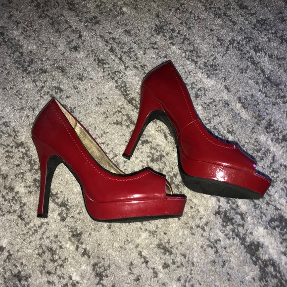 Red peep toe pumps. Heel is 4 inches, 1 inch platform at toe. Size 8.