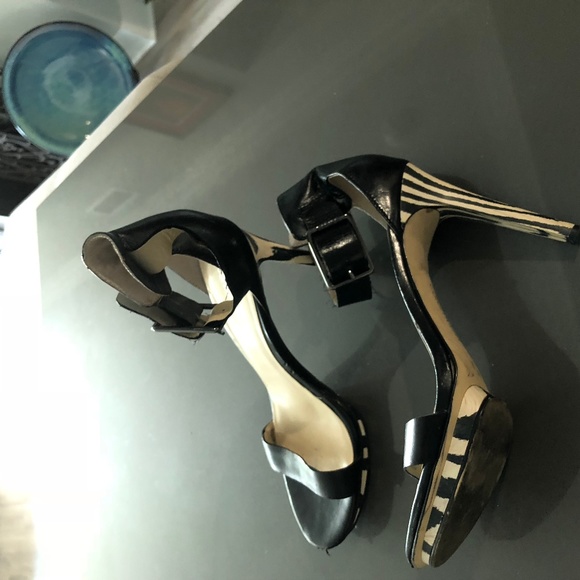 Black ankle strap with black white detailed heel and platform...Elastic at the ankle for easy fit and comfort! Like new very comfortable!